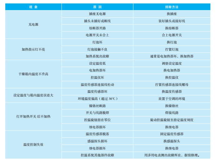 1)干燥箱工作室温度接近设定温度时,加热指示灯忽亮忽暗,反复多次,属正常现象。一般情况下,在测定温度达到设定温度后 30 min 左右,工作室内进入恒温状态。