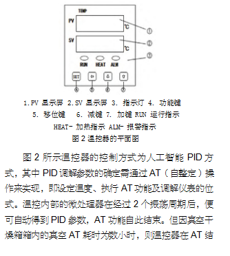 温度失控在真空干燥箱使用中尤其常见,其表现形式有二:一是直接在接通电源和设定温度后加温,建议用万用表来检查真空干燥箱是否存在可控硅短路,如若可控硅短路受损,则可用同一型号的可控硅进行替代修复;二是在接通电源和设定温度后,即使按下“开始”按键,真空干燥箱也不升温,建议用万用表来检查其可控硅或热电偶是否损坏,如若受损,则用同一型号的器件来进行替代修复。一旦排除真空干燥箱温度失控的原因不是上述所言,则可确定其温控电路存在故障。针对这一问题,为了减少资金投入,建议选用G产优质的温控器,同时注意如下事项:一是不得随意变动箱体的加热电路结构布局和传感器温度检测部位;二是确认温控器电参数的匹配程度,以保证其负载能力、控温范围和精度与要求相符;三是尽量少改动温控器与传感器的几何形状和外型尺寸,建议采取如下方法:shou先,拆除与新装温控器不相干的器件,如前面板;其次,通过在前面板处开孔来固定新温控器和传感器探头,并将传感器的引线接在温控器后侧的接线端子上;**后,分别将箱体加热炉丝的两端用粗径导线连在固态继电器端子上和电源的一端上进行调机。针对真空干燥箱温控器的调机,以图 2 所示温控器为例展开讨论。