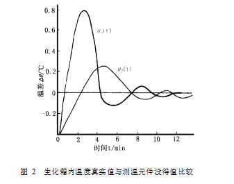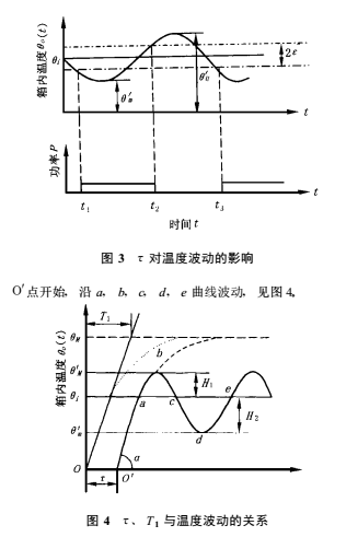3) 的一段时间内, 机内温度仍继续下降, 然后才逐渐上升;而在调节器断开加热器停止加热(t2)后的一段时间内, 机内温度仍将继续上升, 然后才下降。 因此, 生化培养箱温度的实际波动范围将超出设定的温度控制范围 (2ε)。 热传递延时 τ的存在将使温度波动范围加大, τ越大, 上述影响越大。