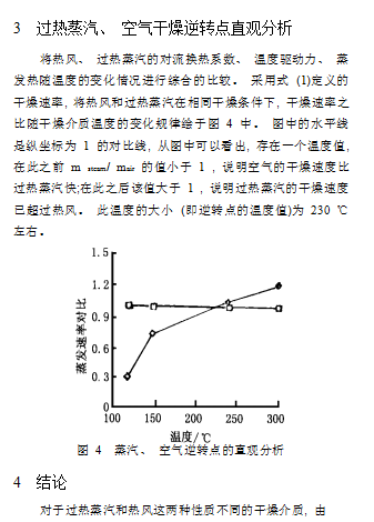 于其基本热力学特性的不同, 在不同的蒸发温度下会反映出不同的蒸发速率变化规律。 考虑恒速干燥段, 在较低的介质温度下, 热风干燥时物料表面温度和介质的温度差比过热蒸汽大许多, 使得在较低温度时 , 热风的干燥速度比过热蒸汽要快;随着温度的升高, 这种温差大所占比例优势明显下降;过热蒸汽的对流换热系数随温度的升高较热风增长得要快, 抵偿了温差小的劣势 ;而蒸发单位水分需用的热量, 过热蒸汽比同样条件下的热风所需的热量要小。正是这三方面的结合使得逆转点存在。